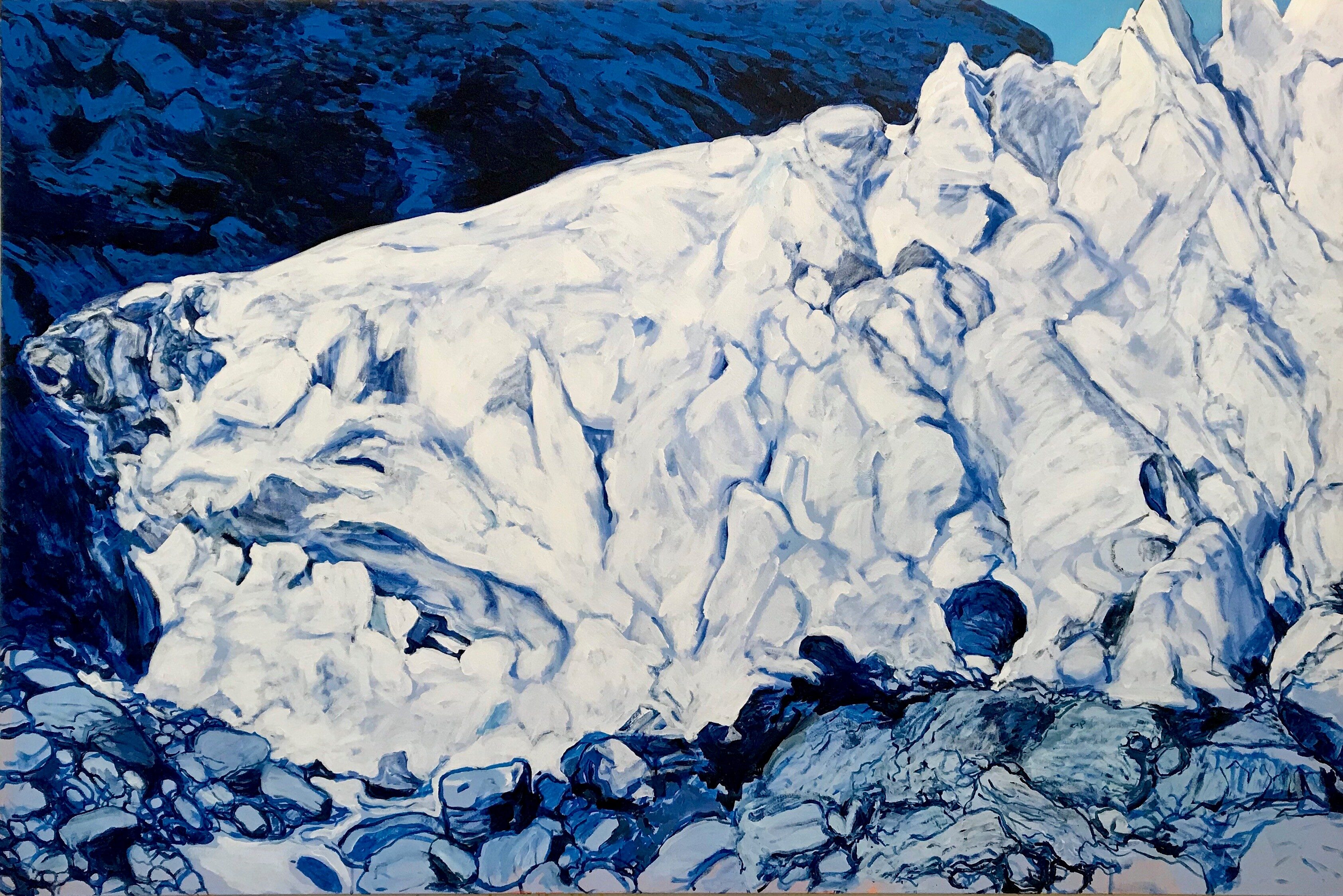 La obra forma parte de una serie de cuadros en los que he decidido ceñirme a la gama de azules, tonalidades frías, utilizadas por su mensaje de uno cierta tristeza o nostalgia. Los cuadros que forman parte de esta serie son mi interpretación de unos paisajes lejanos, evocados desde mi memoria. Un álbum viejo, de fotos hechas hace años en mis viajes por la zona de los glaciares en Nueva Zelanda, me ha servido como fuente de inspiración para esta serie.